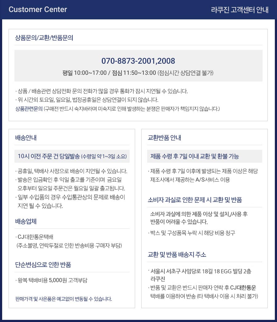 - 정확한 반품/교환비는 고객센터로 문의 시 확인 가능합니다.