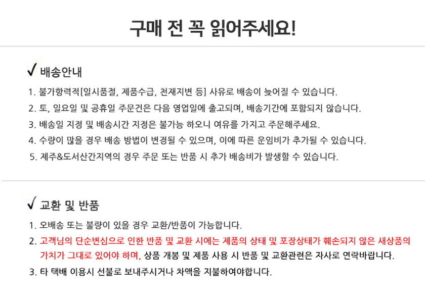 - ※ 주문 폭주, 또는 택배사 사정에 따라 배송일이 달라질 수 있습니다.